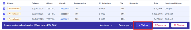 - Validación masiva, se puede realizar la validación conjunta de las facturas que estén en estado 'Pre-validado'. Esta opción está disponible a través del botón de 'Validar', que aparece en el listado de facturas, una vez se hayan seleccionado los documentos que se deseen validar de forma masiva.