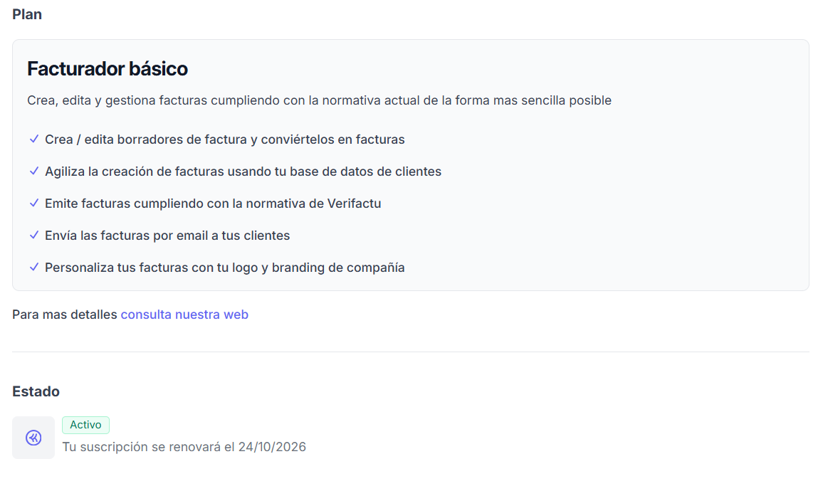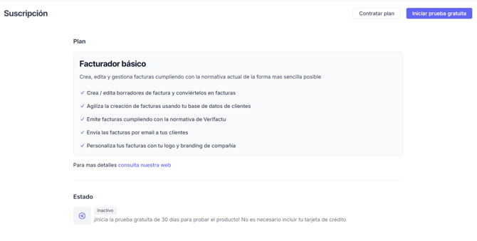 En esta pantalla podrás ver los planes disponibles, junto con un resumen de lo que incluye cada uno. Actualmente encontrarás disponible el facturador básico.