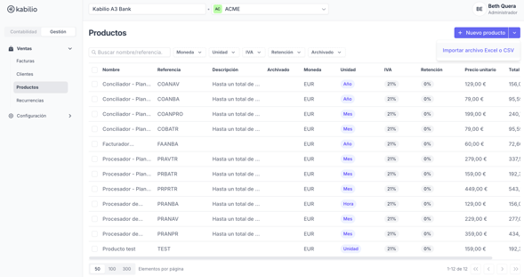 El importador de productos te permite añadir todos tus productos y servicios en Kabilio de forma masiva desde un archivo Excel o CSV. Es útil cuando: