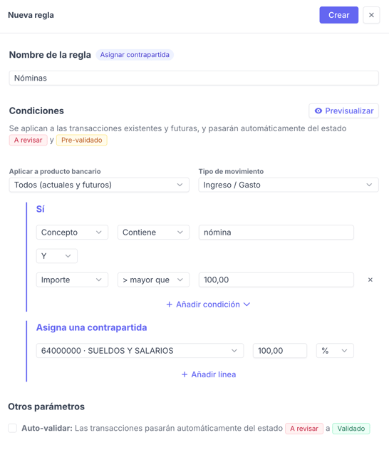 - Nombre de la regla: Un nombre descriptivo (ej: "Comisiones bancarias").