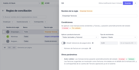 Automatiza la asignación de contrapartidas y el emparejamiento de facturas con reglas personalizadas.