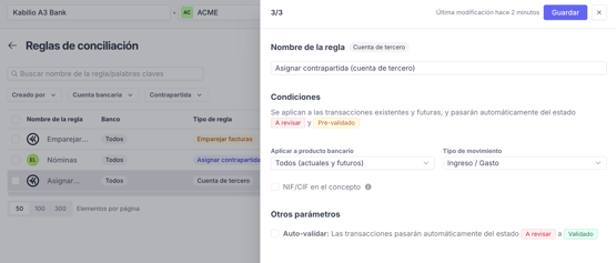 - Puedes configurar la regla para que sea más restrictiva y solo se aplique la contrapartida cuando se detecta el NIF/CIF del tercero en el concepto.